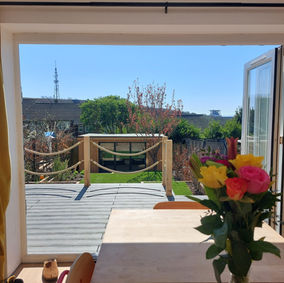 We created a large composite deck with a lovely oak pergola, half roofed half open to allow sun worshippers and shade seekers alike to enjoy it.